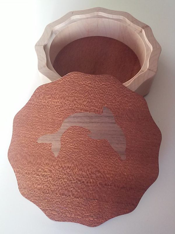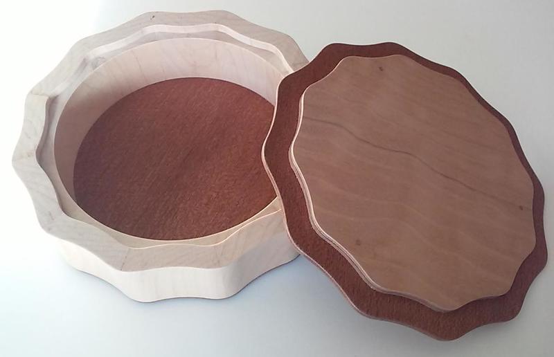 An all face grain box made from twelve vertical pieces of Maple machined into a cloudlike shape. The bottom and top are five ply Sapele, the subtop is seven ply Western Maple and the inlay is three ply Walnut. Finish: WB acrylic, Size: ~5-3/8 x 1-3/8"
