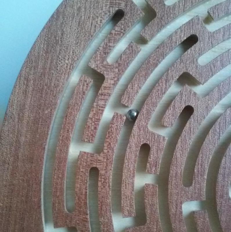 A ball in a maze that doesn't need an acrylic cover to keep the ball in the maze. The maze has three start/end points, center plus two on the perimeter. The two setscrews (back) are the perimeter marks (top) and allow running the maze with more than one ball. It's a working protype that was made with MDF, Koto (e.g. back) and Makore (top). Finish: WB acrylic, Size: 8-1/2 x 7/16".